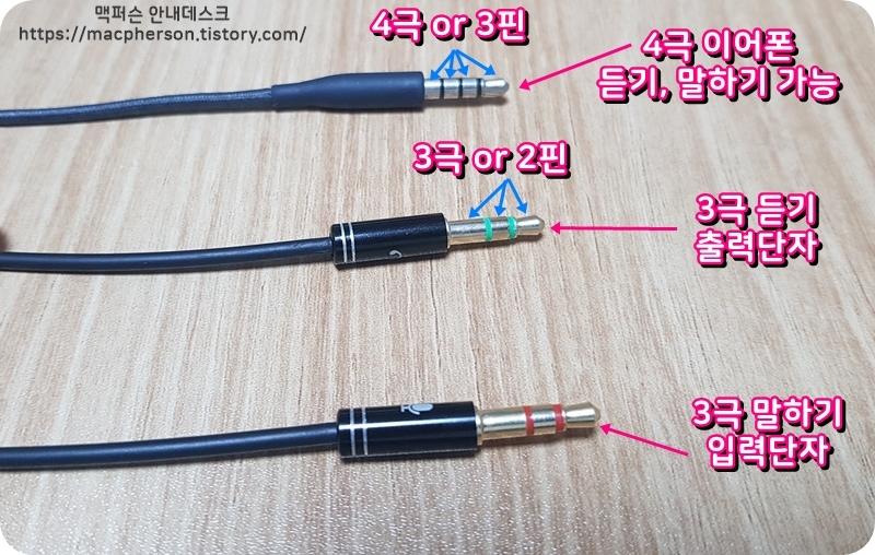 위 사진처럼 각 단자 끝을 살펴보면 띠 형태로 감긴 것을 알 수 있다. 이 띠가 2개 감기면 단자가 3 부위로 분할되니 3극 단자라고 한다. 이러한 3 극단자는 한 가지 기능만 가능하다! 즉, 이어폰처럼 듣기(출력)만 된다던지 혹은 마이크처럼 말하기(입력)만 가능하다. 반면 맨 위에 삼성 이어폰은 띠가 3개 감긴 4극 단자다. 4 극단자는 두 가지 기능이 동시에 가능하다. 그래서 4극 이어폰은 듣기와 말하기가 가능하다.