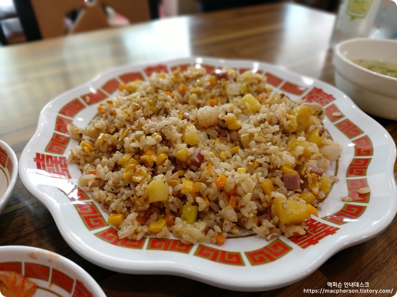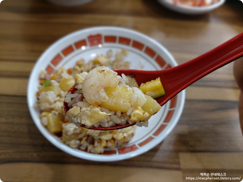 강한 불에 빠르게 볶는 중식 스타일(?)의 볶음밥이라서 그런지 주방에서부터 불향이 강력하게 펴져 나왔어요. 아니나 다를까 맛을 보니 불향이 듬뿍 베인 볶음밥이었어요. 간간히 입에서 터지는 새우와 달콤한 파인애플 조합은 지금도 생각나네요.