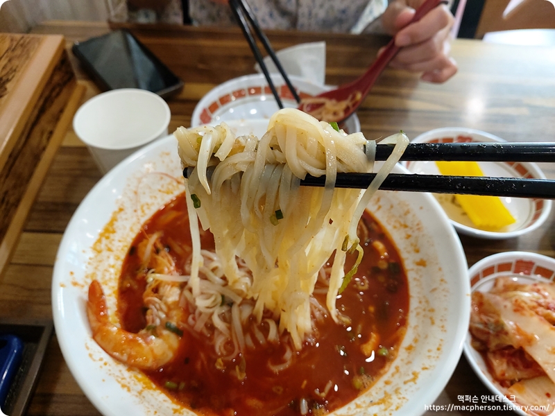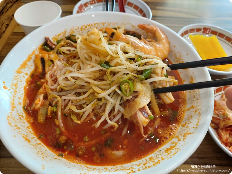 양이 보이시나요? 상당히 많아요. 특이라는 이름이 괜히 붙은 게 아니더라고요. 분명 작은 그릇이 아니었는데 그릇 가득히 재료가 담겨 있었어요. 새우랑 다양한 해물이 있어서 국물이 시원하고 좋더라고요. 색에 비해서 맵기는 일반적인 짬뽕 정도였어요. 매운 걸 원하시면 스리라차 소스를 추천드려요.