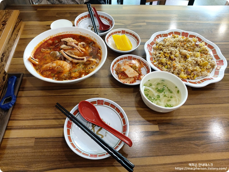 사진 찍는다고 이것저것 둘러보다 보니 메뉴가 나왔어요. 해물 쌀국수는 특이 붙어 있어서 그런지 확실히 양이 많았고 볶음밥도 양이 상당했어요. 일반적인 중식 볶음밥보다 많은 양이예요. 근데 맛있어서 금방 먹어요..