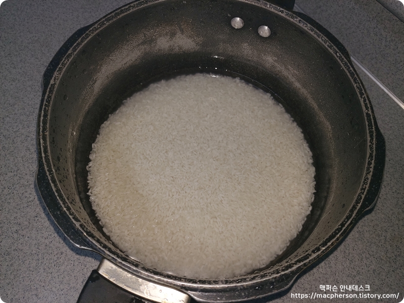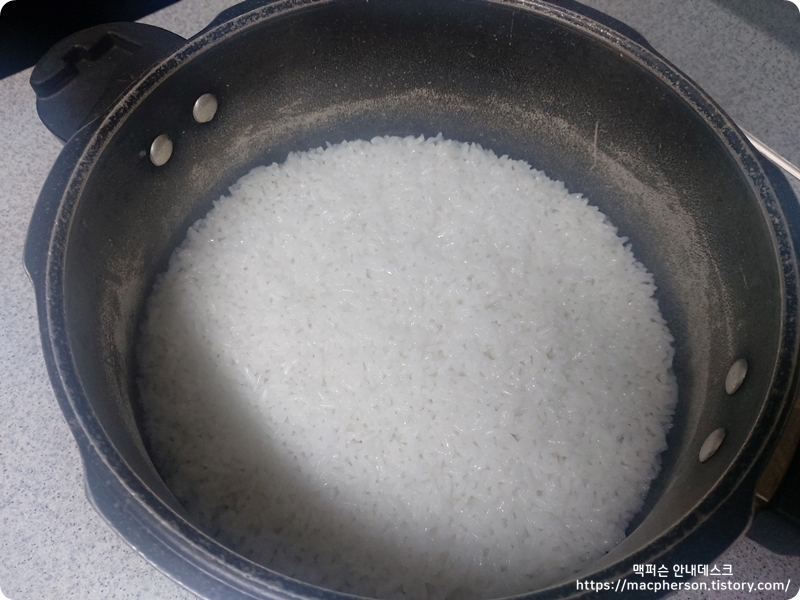 이번에 칼로스쌀을 30분간 물에 불려보았습니다. 쌀알이 물기를 머금으니 부피가 커집니다. 물을 한껏 머금고 나니 중립종 특유의 늘씬한 쌀알이 눈에 잘 띕니다. 확실히 물에 불리니 길쭉한 느낌이 와 닿습니다. 그럼 이 쌀로 밥을 지으면 어떻까요? 밥알도 길쭉길쭉할까요? 아래 사진을 통해서 확인해 보겠습니다.