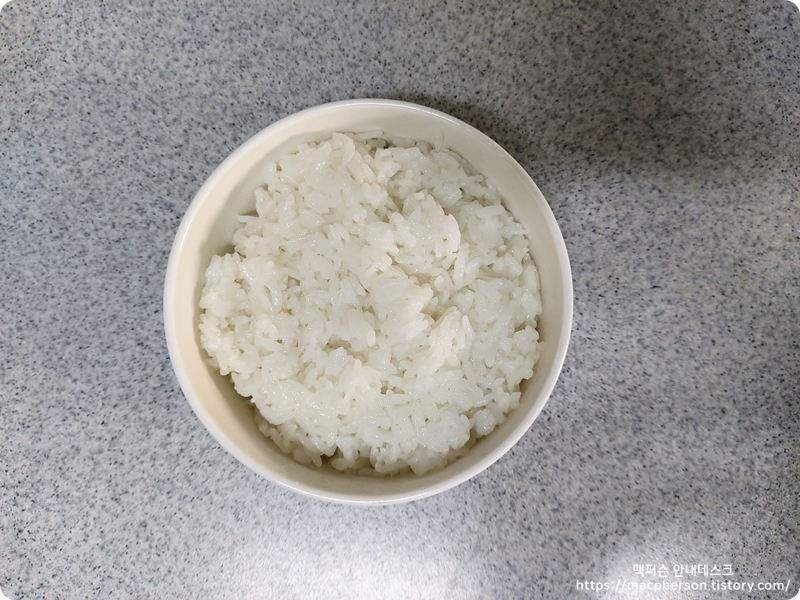 어떠신가요? 쌀알에서 길쭉함이 느껴지시나요? 그렇지 않지요? 물에 불렸을 때만 해도 쌀알이 길쭉한 것이 보였는데 실제로 밥을 지어보면 그러한 특징은 사라집니다. 그냥 일반적인 국산 쌀로 지은 것과 같은 모습니다. 실제로 지인분들께 칼로스 미국쌀로 대접을 했지만 차이를 모르셨습니다.