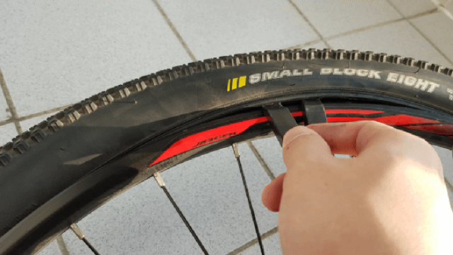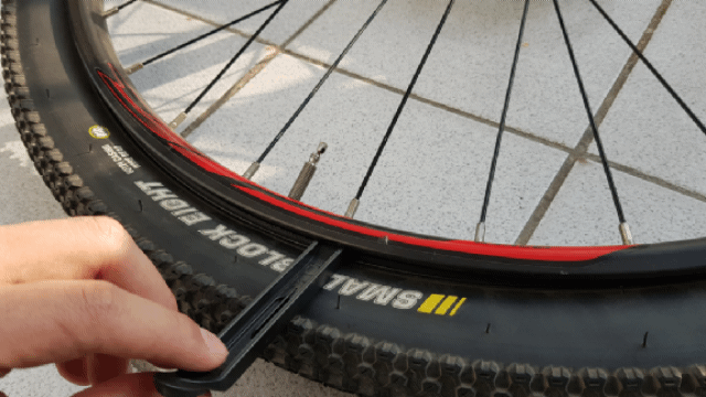 타이어 측면부에 걸어 놓고 지렛대 원리를 이용해서 당겨줍니다. 그리고 레버의 반대쪽 끝부분을 스포크에 걸어주시면 됩니다. 제 글보다 위 사진을 보시면 쉽게 이해가 되시리라 생각됩니다. 그러면 림 안쪽으로 말려있던 타이어가 외부로 나오게 됩니다.