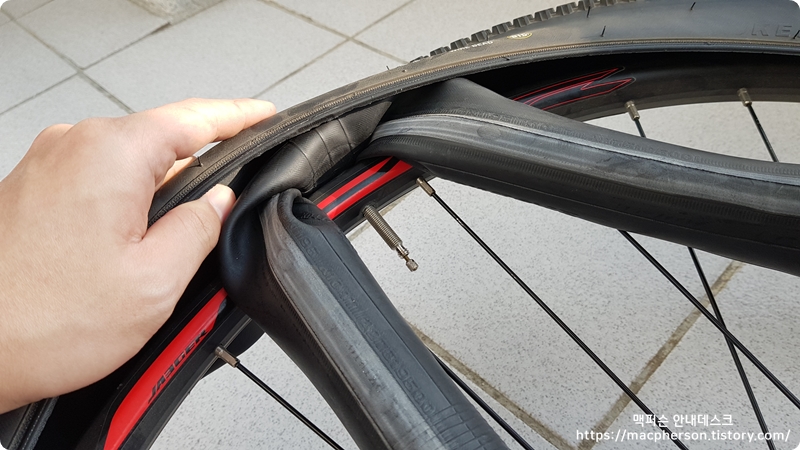 타이어 튜브를 완전히 분해했습니다. 생각 외로 간단합니다. 조립은 분해의 역순입니다. 밸브 쪽 튜브를 먼저 장착하고 나머지 튜브를 넣어줍니다. 그리고 타이어를 림 내부에 넣어주시면 됩니다. 이 과정은 별도의 장비 필요 없이 맨손으로 쉽게 하실 수 있습니다. 그 뒤에 바람을 넣고 타이어를 프레임에 조립하시면 됩니다.
